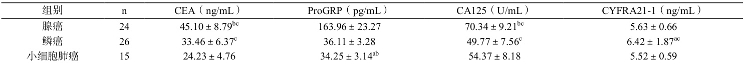 小细胞肺癌组的 ProGRP 水平最高,腺癌组的 CEA、CA125 水平最高