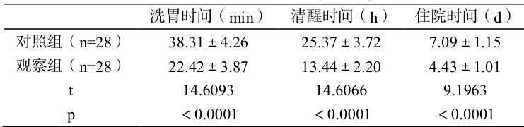 对比观察两组救治效果(洗胃时间、清醒时间、住院时间)。
