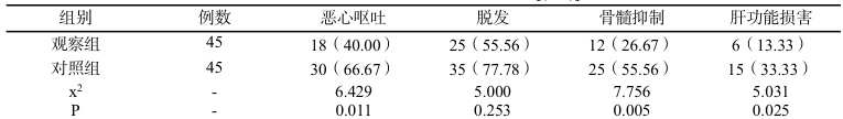 观察组患者恶心呕吐、脱发、骨髓抑制、肝功能损害等不良反应发生率均低于对照组, (∇P<0.05) ,见表2。 表2 两组患者不良反应发生情况比较 [(n%)]