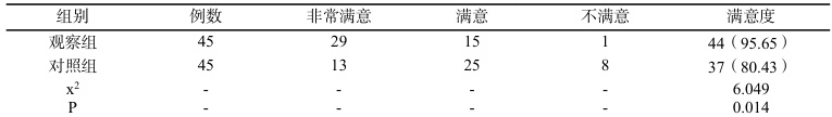 观察组患者的护理满意度高于对照组, (∇P< 0.05) 这是因为多学科协作护理模式能够满足患者诸多需求,让患者感受到细致周到的关照。在多学科协作护理干预下,小组成员多向患者交流心得,能快速掌握其需要,同时不断完善和创新护理方案。小组成员间形成了密切合作,让护理工作的成效得以发挥,为患者提供方便,免于游走于各科室之间,快速见到了护理成效。多学科协同护理还可以给患者更多的健康指引,让患者对自己的病情和自身管理有一个更加深刻的认识,同时也可以加强患者的自我干预,提升患者的健康意识。