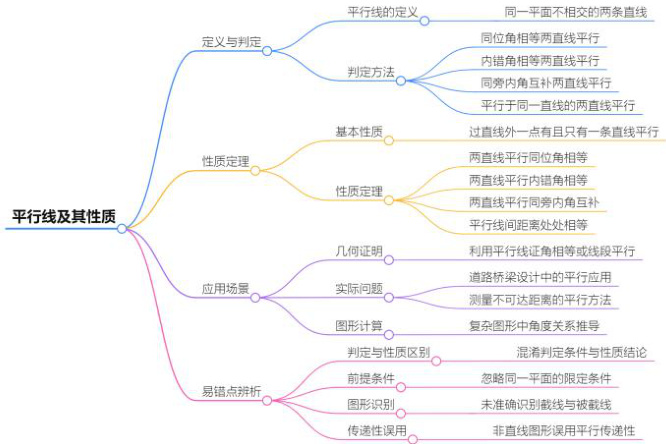 在初中几何的教学中,平行线的判定与性质是学生必须掌握的核心内容。教师可以以“平行线及其性质”为中心绘制思维导图,依次展开“判定方法”“性质规律”和“应用场景”三个分支。学生在学习过程中,通过导图能够迅速形成知识框架,明确判定条件与性质之间的对应关系。例如,在解几何证明题时,学生可直接从导图中回忆“若同位角相等,则两直线平行”,并进一步利用“平行线内错角相等”进行推理。导图不仅让抽象的角度关系更直观,也帮助学生在复习阶段高效回顾和迁移应用,从而实现由知识梳理到能力提升的转变。