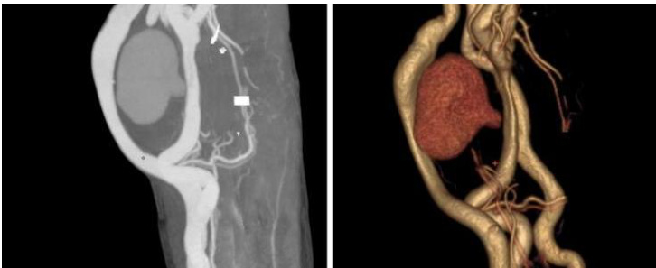 图 2. 上肢血管 CTA 及重建,明显可见肱动脉破口及造影剂流经假性动脉瘤腔内形成的椭圆形瘤腔。