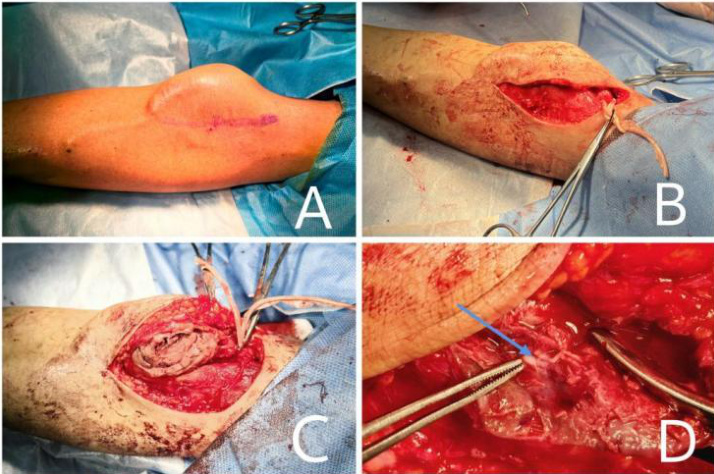 图 3.A 左侧肘部可见一 7cm*8cm*3cm 隆起包块;B 纵行切开,分离出近心端肱动脉及瘤体;C手术切开后显露假性动脉瘤的瘤体壁及瘤体内血栓;D肱动脉破口(蓝色箭头所示)。