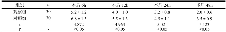 观察组术后6h、12h、24h、48h 的疼痛评分均显著低于对照组,差异有统计学意义( ⋅P<0.05) 见表1。表 1 两组患者术后不同时间点疼痛评分比较(x±s,分)