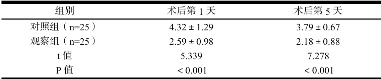 如表 1 所示,观察组术后第 1 天与术后第 5 天机体疼痛水平低于对照组,