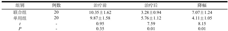 治疗前两组患者的VAS 评分差异无统计学意义( P>0.05) 在接受干预之后两组患者的VAS 评分均显著下降且联合组降幅明显更高,差异有统计学意义( 'P<0.05 )。详细数值见表2。