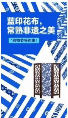 蓝印花布的现代重构:在“常熟非遗购物节”海报中,将传统纹样转化为几何色块,搭配电商风格的版式(图 2)。