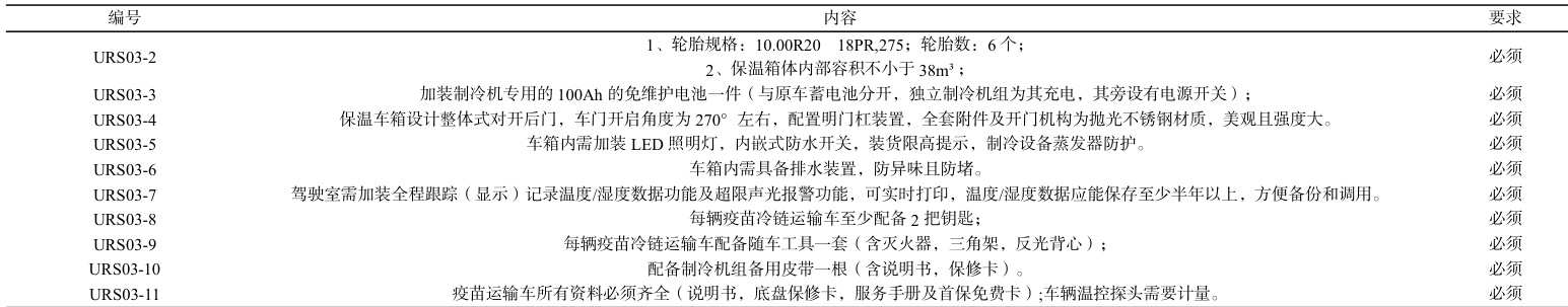 疫苗冷链运输车的主要作用为保障疫苗运输环节的温度控制在 2-8℃范围内。用户需求文件总括了用户对疫苗冷链运输车的质量要求,也描述了用户对疫苗冷链运输车的工作过程及功能期望。要点如下: