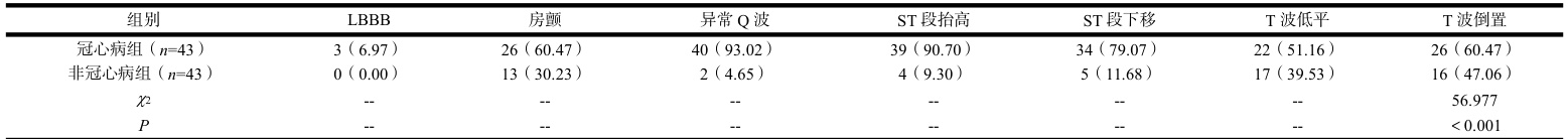 在异常Q 波、ST 段抬高、下移、房颤、T 波倒置、LBBB 等比率上,冠心病组较高( (P<0.05) ,见表1。
