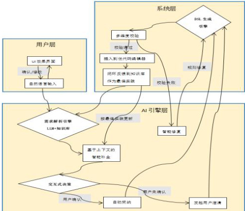 系统总体架构分为用户层、AI 引擎层、系统层,形成一个交互式、迭代优化的闭环流程。系统通过在关键节点与用户进行多轮交互和确认来逼近用户的真实意图,从而最大化提升理解用户意图的准确率[3]。