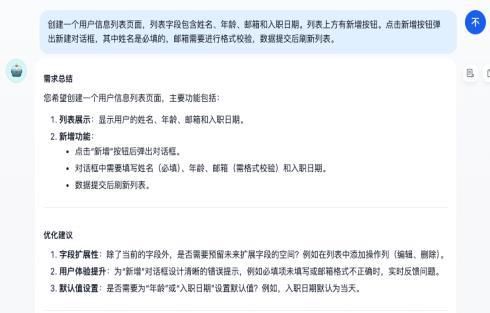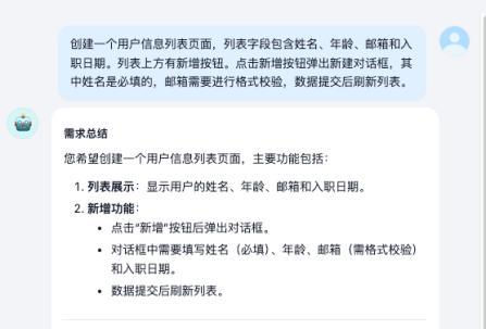 1)用户输入:用户通过自然语言描述期望的页面功能,例如“我需要一个用户信息管理页面,包含姓名、年龄、邮箱和入职日期的表单,姓名是必填的,邮箱需要进行格式校验,点击新增按钮弹出新建对话框,数据提交后刷新列表”。