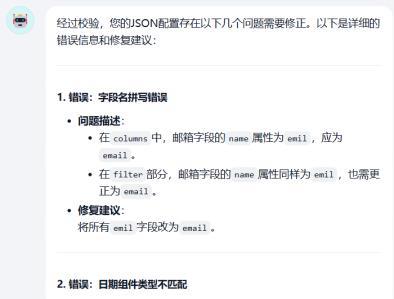司 经过校验,您的JSON配置存在以下几个问题需要修正。以下是详细的错误信息和修复建议:1.错误:字段名拼写错误·问题描述:·在fi1ter部分,邮箱字段的nane属性同样为emi1,也需更·修复建议:将所有eni1字段改为enail。2.错误:日期组件类型不匹配