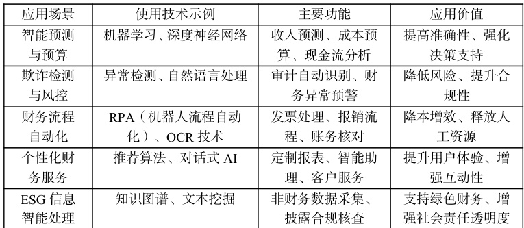 随着 AI 技术逐步成熟并在企业级应用中落地,其在财务管理领域的融合程度持续加深,推动财务职能从事务处理向战略支持转变。本章系统梳理人工智能在财务管理系统中的主要应用方向,如表 1 所示,涵盖智能预测、风险控制、流程自动化与个性化服务等核心模块,展示其在提升财务效率、精准决策和风险防控方面的关键价值。