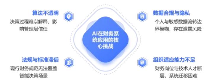 综上,AI 在财务管理系统中的应用已覆盖决策制定、风险识别、流程执行与外部沟通等多个层面,不仅提升了财务运作效率与透明度,也推动财务从“后台核算”向“价值创造”角色的跃升。下一章节将围绕这些应用背后存在的挑战进行深入剖析,为构建安全、合规、智能的财务AI 系统提供理论支撑。