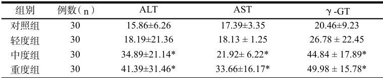 2.1 各组肝功能水平对比中度组、重度组 ALT、AST、γ-GT 均高于对照组,差异均有统计学意义 (P<0.05) 。结果见表 1.