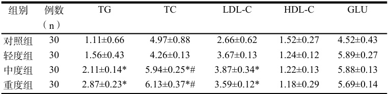 2.2 血脂、血糖水平比较中度与重度组的 TG、TC、LDL-C 及 GLU 水平均显著高于对照组,HDL-C 水平显著低于对照组,差异均有统计学意义 (P<0.05) 。与轻度组相比,中度及重度组的TC 和 GLU 水平亦显著升高 (P<0.05) ;其 TG、LDL-C 水平虽高于轻度组且 HDL-C 水平低于轻度组,但差异无统计学意义 (P>0.05) 。具体数据见表 2。