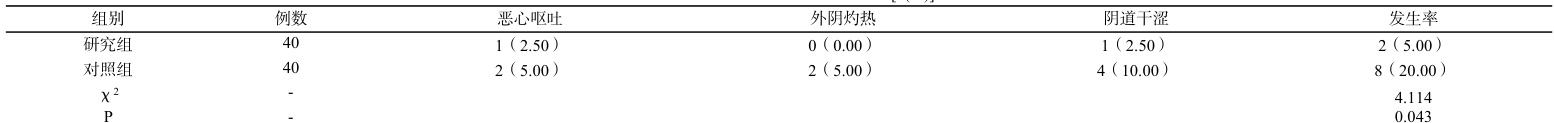 (3)对比两组患者治疗期间不良反应发生率,包括恶心呕吐、外阴灼热、阴道干涩等。