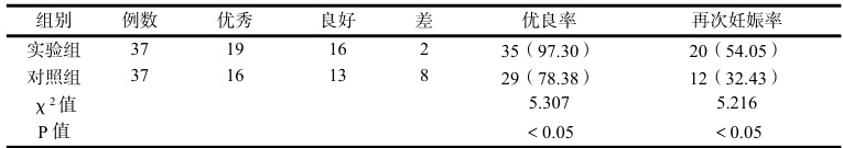 实验组术后伤口愈合优良率、再次妊娠率均比对照组高,见表4。