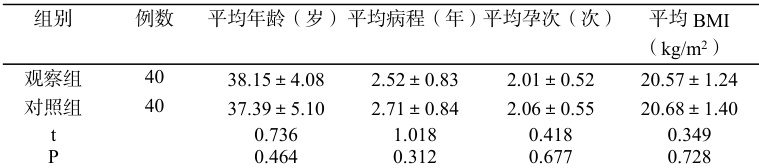 选取 80 例子宫腺肌症患者,纳入期限 2024 年1 月至 12 月,将患者随机分组。两组基线资料无明显差异( P>0.05 )。见表 1。