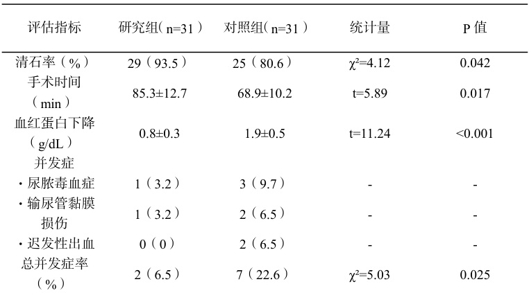 术后 3 个月CT 平扫评价碎石情况,小于 3mm 残余结石为清石成功。术中监测血红蛋白降低情况作为客观出血量指标。记手术开始到结束的手术时间,衡量手术耗时。出现尿脓毒血症、输尿管黏膜撕脱、迟发性出血作为并发症记录,衡量手术的安全性。术后24 小时进行 VAS 评分记录疼痛程度,作为术后好转的量化指标。此观察指标体系兼顾术后康复疗效与患者的主、客观评价,旨在更加客观和立体地衡量两种术式的价值。