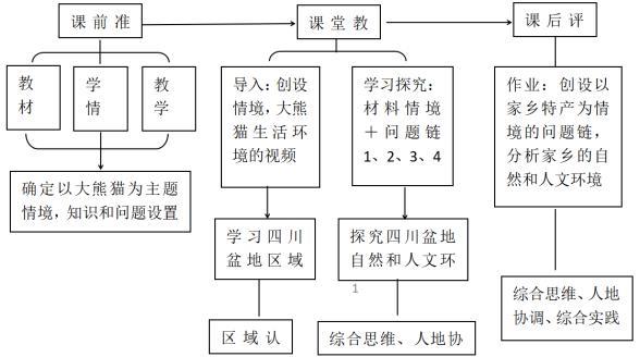 新课标理念下,情境教学的教学设计,要求真实的情境+问题,凸显重难点,注重学习逻辑培养、认知逻辑启迪、思维逻辑构建,引导学生关注身边地理和生活,学会解决身边复杂情境中的问题,提高核心素养。下面笔者以粤教版八年级下册《四川盆地》为例,对初中地理课堂融入情境的有效教学设计展开叙述,下图为课堂教学的整体思路。