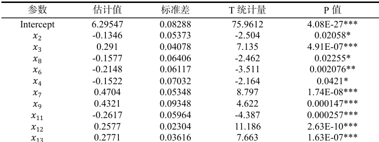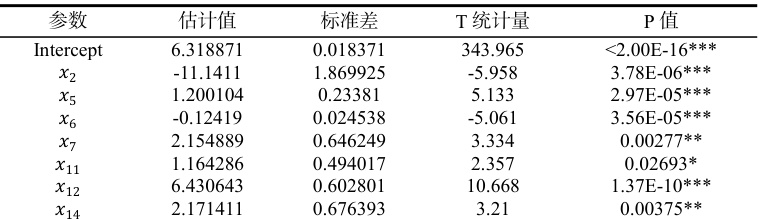 范数惩罚项,从而实现对模型参数的约束。该方法广泛应用于参数估计和变量选择,能够在拟合过程中同步完成特征筛选与系数估计,是一种兼具正则化和稀疏特性的建模技术。与岭回归类似,LASSO 通过将原约束优化问题转化为无约束的惩罚函数最小化问题来实现建模;不同之处在于,LASSO 倾向于产生稀疏解,即使得部分系数精确为零,从而更适用于特征选择。尽管 LASSO 回归通常没有解析解,需借助数值优化算法进行求解,但其在变量筛选方面的显式效果和解释性优势,使其在许多高维数据分析场景中表现出重要的实用价值。数据分析过程中,LASSO 回归通过R 软件中的glmnet 包实现,筛选出了11 个变量,再进行线性回归,结果有7 个显著性变量: x2 、 x5 、 x6 、 x7 、 x11 、 x12 、?14,LASSO 回归模型变量选择结果见表2。