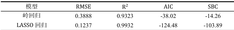 基于均方根误差(RMSE)、决定系数 (R2) 、AIC 和SBC 准则,对比岭回归与 LASSO 回归模型的性能(表 3),以选择最优模型。