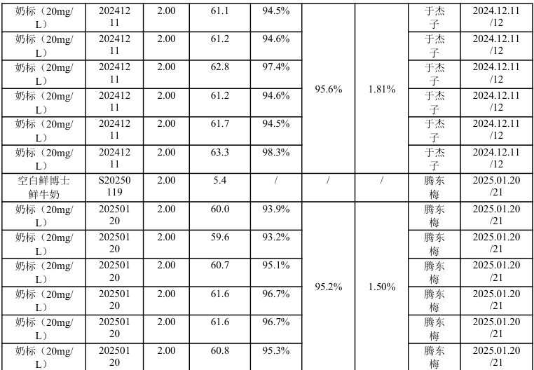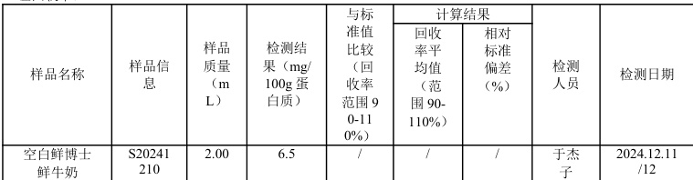 检测鲜博士鲜牛奶 485ml 糠氨酸数值为 6.5mg/100g 蛋白质、5.4mg/100g 蛋白质,符合要求(内控标准≤8.0mg/l00g 蛋白质),且与平日使用 6g/L 的乙酸铵溶液数值一致,无变化,平日使用乙酸铵溶液检测此产品数值(4.5-7.5mg/100g 蛋白);同时进行了 双人6 平行测试,人员1 检测回收率范围为 94.5%98.3% ,回收率平均值为 95.6% ;人员2 检测回收率范围为93 2%96.7% ,回收率平均值为 95.2% ;双人验证奶标回收率均在范围内,符合 GB/T 27404 被测组分含量 1-100mg/kg ,回收率范围为 90-110% 。重复性最大值为 1.81% ,在目标值 5.3%PA ,符合分析性要求。