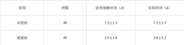 观察组患者的症状缓解时间和住院时间均短于对照组,差异有统计学意义 (P<0.05) )。具体数据见表 1: