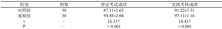 较对照组,观察组理论考试成绩、实践考核成绩均较高( (P<0.05) 。见表 1。