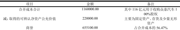 2016 年10 月,金马股份以116 亿元现金+发行股份方式收购众泰汽车100%股权。根据众泰汽车2015 年年报披露,此次交易合并成本为116