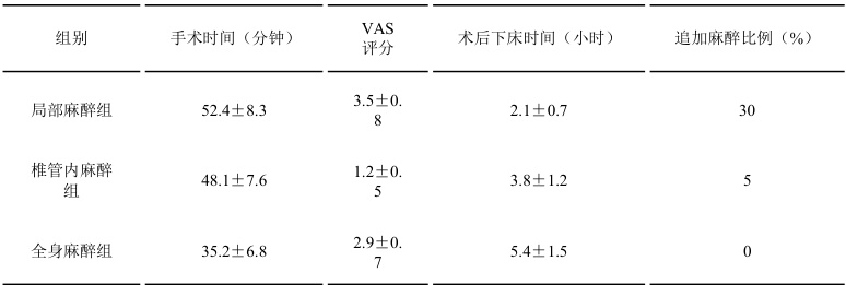 椎管内麻醉组术后VAS 评分显著低于其他两组 (F=18.6,p<0.01) ),全身麻醉组手术时间较局部麻醉组缩短42% (1=4.3,p=0.002) 。局部麻醉组术中追加麻醉比例 (30%) )显著高于椎管内麻醉组 (5% , x2=7.8,p=0.005) 。