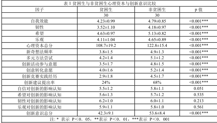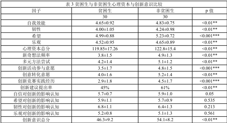 根据统计结果显示,贫困生和非贫困生心理资本、创新意识各因子均存在极其显著的差异。