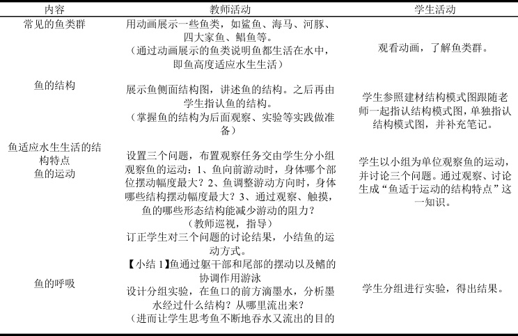 生物是自然学科,是实验的科学。在学习生物学的过程中,实践是非常重要的手段和方法。即学生的学习是主动的,知识是在学生主动学习过程中生成的。同时,学生的主动学习也有助于学生深度学习的发生。所以,在设计《鱼》这节课之初就确定了一个大前提,学生主动生成相关概念,而非讲授。