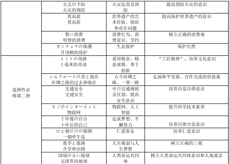 本文以普通高中使用的人教社出版的高中日语教材为研究对象。其中包含3 本必修,2 本选择性必修,每本必修4 课,共12 课;选择性必修每本8 课,共16 课的内容。对教材中所涉及的思政元素进行归纳分类,如下表会发现主要其主要包括爱国主义、文化自信、正确的三观、环境保护、仁爱意识、自觉自律、人类命运共同体意识等。并随着年级递增,教材中的思政元素逐渐完善,学生思政素养的培育要求,亦呈螺旋式地循序渐进。