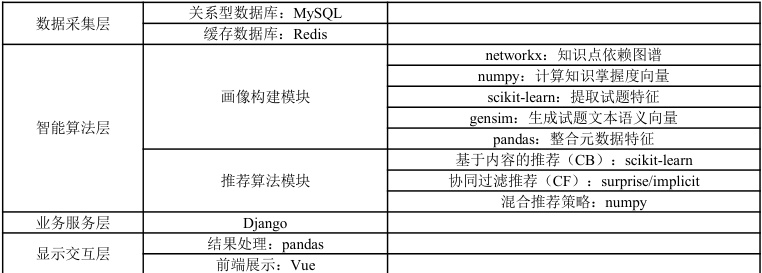 数据采集层通过用户行为数据(答题记录、收藏、停留时长)与试题基础数据(题干、知识点分类、题型)构建推荐基础,经清洗预处理后输入画像层,技术上常用 MySQL 与 Redis 实现数据存储;智能算法层先构建学习者画像(基于 networkx 构建 Python 知识点图谱,numpy 计算知识掌握度向量,pandas 生成能力模型与偏好特征)和试题画像(scikit-learn 提取 TF-IDF 特征、gensim 生成 Word2Vec 语义向量,pandas 整合元数据与统计特征),再通过 CB 算法(scikit-learn 计算余弦相似度适配冷启动)、CF 算法(surprise/implicit 实现ALS 挖掘潜在兴趣)及动态权重混合策略(numpy 加权融合)生成推荐;业务服务层采用 Python 的 Django 框架,以 MVT 架构为逻辑中枢,衔接前后端与数据存储,支撑系统业务运转。