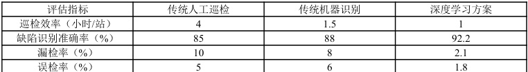 为客观评估深度学习方案的优越性,本研究选取传统人工巡检、传统机器识别及深度学习方案进行横向对比,评估周期持续3 个月,覆盖10 座220kV 变电站的1900 余台设备。核心性能指标如表1 所示。