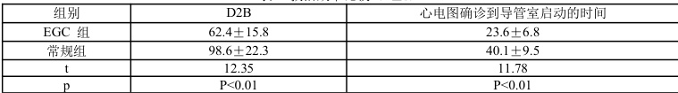 EGC 组 D2B 时间为( (62.4±15.8) )分钟,显著短于常规组的 (98.6±22.3) )分钟,差异有统计学意义(t=12.35,P<0.01)。进一步分析显示,EGC 组从心电图确诊到导管室启动的时间为 (23.6±6.8) )分钟,较常规组的(40.1)分钟缩短 41.2% ,差异显著(t=11.78,