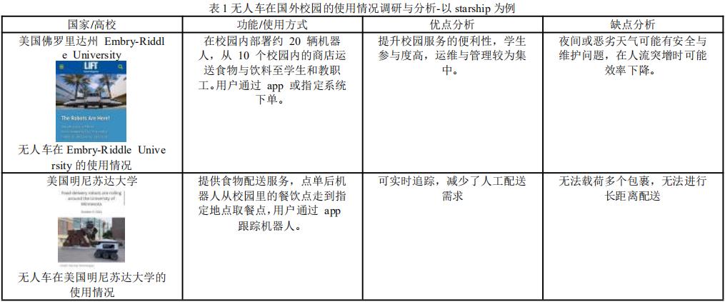 在国外校园无人车的实践中,Starship品牌的无人车应用较为广泛,因此在本研究中选择Starship作为分析对象。表1整理了其在不同校园的应用情况,以及使用中暴露出的优缺点,为后续设计提供参考。