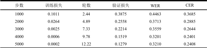 训练参数设置:最大步数5000 步,学习率1e-5,批量大小32,每1000 步进行一次评估。采用词错误率(WER)和字符错误率(CER)作为评估指标。