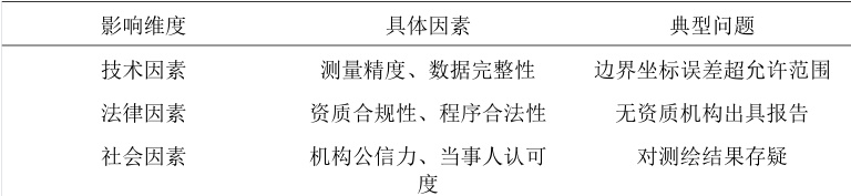 测绘成果的证据效力会受到多种因素的制约(如表 1 所示)。从技术方面来讲,仪器所具备的精度以及所采用的测量方法,这两者会对成果的准确性产生直接影响。从法律层面来看,测绘成果是否契合《测绘成果质量检查与验收》(GB/T24356-2009)等相关标准,这将决定其是否具有合法性。就社会层面而言,当事人对于测绘机构资质的认可程度,会对证据的接受程度造成影响。依据某省在2022 年土地征收纠纷方面的数据来看,由于测绘程序不够规范而导致证据无效的案例,其占比达到了 21% 。