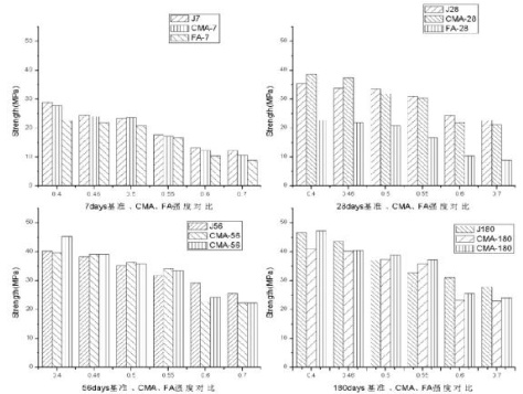 (1)在 7、28 天龄期,CMA 混凝土的强度高于 FA 混凝土强度。在 56 天龄期,W/C 0.5 时,CMA 混凝土的强度小于 FA 混凝土的强度,W/C 0.50 时,CMA 混凝土的强度高于 FA 混凝土的强度。180 天龄期, CMA 混凝土的强度小于 FA 混凝土的强度。(2)W/C 越小 CMA 混凝土的 fcu 越大,二者满足 y=a+bx 方程;龄期增加 CMA 混凝土的强度提高,二者满足