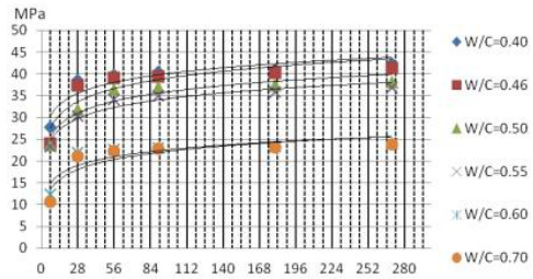 图 3-2 和表 3-1 表明:CMA 混凝土的强度随龄期的增长而提高,强度与龄期可以