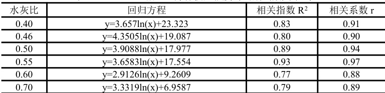 与龄期 x 的对数满足一次函数关系的试验结果与文献[5]的试验结果一致。
