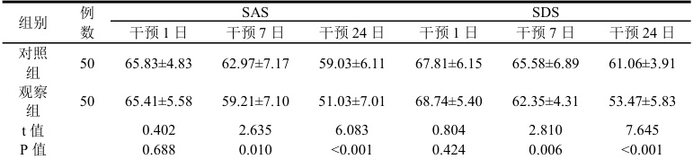 。然而随着时间的推移,观察组的焦虑和抑郁程度均表现出改善。两组对比 SAS 及 SDS,干预7 日,干预24 日,对照组评分均显著高于观察组,显著差异(p<0.05) )。