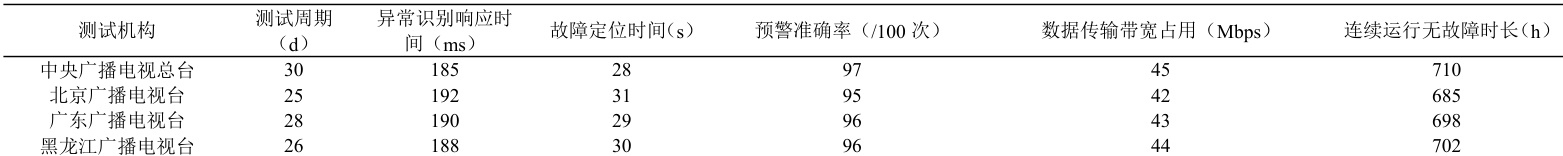 系统功能测试联合国内 4 家不同规模的广播电视机构推进,测试周期根据各机构业务量、覆盖范围及新媒体业务占比差异设定,均覆盖完整业务周期以确保数据有效性,重点围绕异常识别、故障定位、预警、数据传输及稳定性五项核心功能展开验证(见表1)。从测试结果来看,系统在异常识别响应上均控制在 200ms 以内,故障定位时间不超过 31s 且能精准锁定端口,100 次测试中预警准确率最低达 95 次,数据传输带宽占用稳定在 42-45Mbps,连续无故障运行时长均超 680h,整体表现满足融合媒体环境下不同地域、不同业务规模广电机构的信号链路监控技术需求。