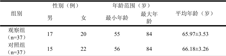 将黄石市某三级甲等医院心血管内科于2024 年1 月至2024 年12 月收治的74 例行冠心病支架术患者,随机分为观察组、对照组,各37 例。两组患者临床资料如表 1 所示: