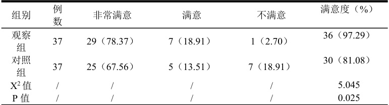 在护理满意度方面,观察组为 97.29% (36/37),对照组为 81.08% (30/37),观察组明显高于对照组,有统计学意义, P<0.05 ;见表 2.