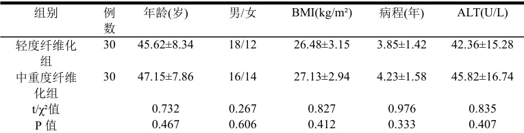 回顾性分析2021 年1 月至2024 年1 月我院收治的60 例非酒精性脂肪肝病患者临床资料。根据肝纤维化程度分为轻度纤维化组(F0-F1 期)30 例和中重度纤维化组(F2-F4 期)30 例。