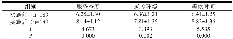 实施后门诊质量评分明显高于实施前( ⋅P<0.05⋅ )。见表 1。